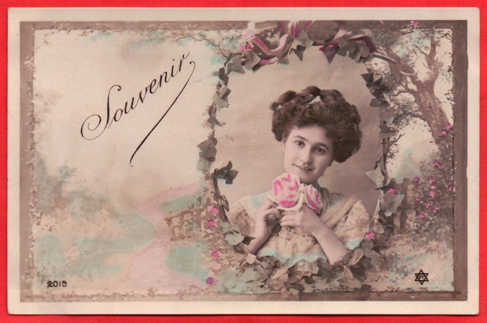Title (ebay affiliate link): Beautiful Lady Portrait Rose Souvenir Landscape original old 1910s postcard