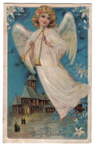 Title (ebay affiliate link): Angel Blowing Double Horn Over Church~Merry Christmas~B.W. 292~1907