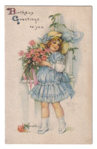 Title (ebay affiliate link): Young Girl in Blue Dress Holding Bouquet of Roses~Birthday Greeting~1907+