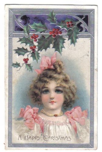Title (ebay affiliate link): Cute Girl Standing Under Holly & Berry~Happy Christmas~1908~Silver Border