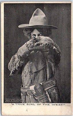 Title (ebay affiliate link): 1907 COWGIRL Postcard "A TRUE GIRL OF THE WEST" Albertype Ponca, Oklahoma Cancel