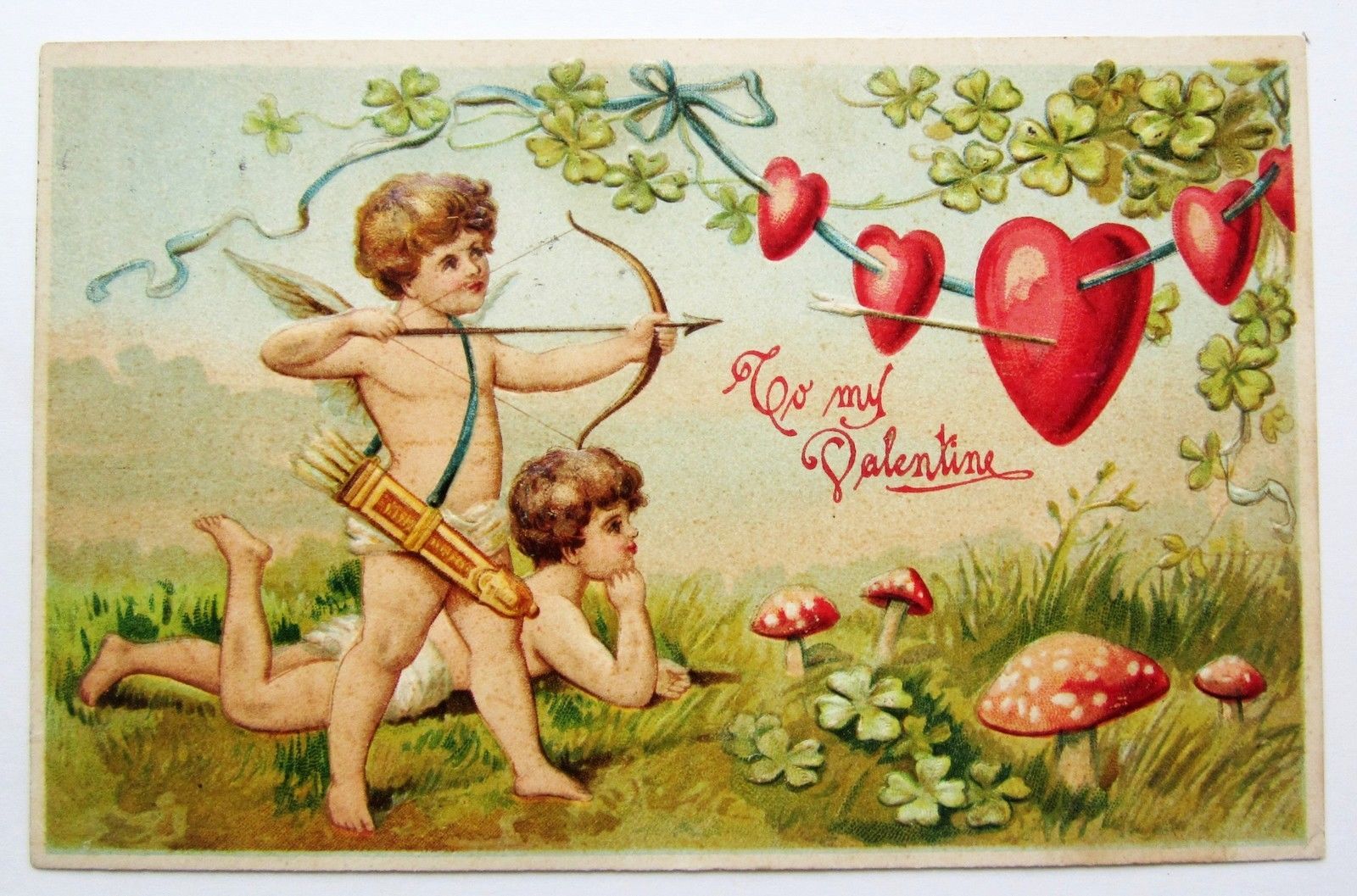 Title (ebay affiliate link): CUPID Shoots Heart Red Mushrooms VALENTINE Embossed Postcard