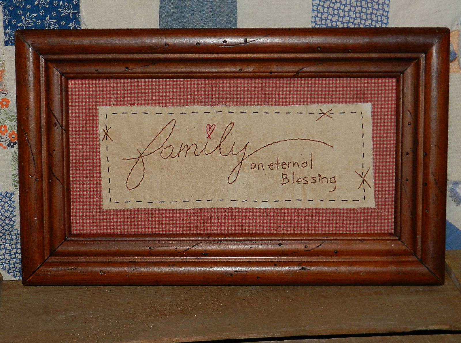 Title (ebay affiliate link): Primitive Handmade Framed Stitchery Family an Eternal Blessing The Olde Saltbox