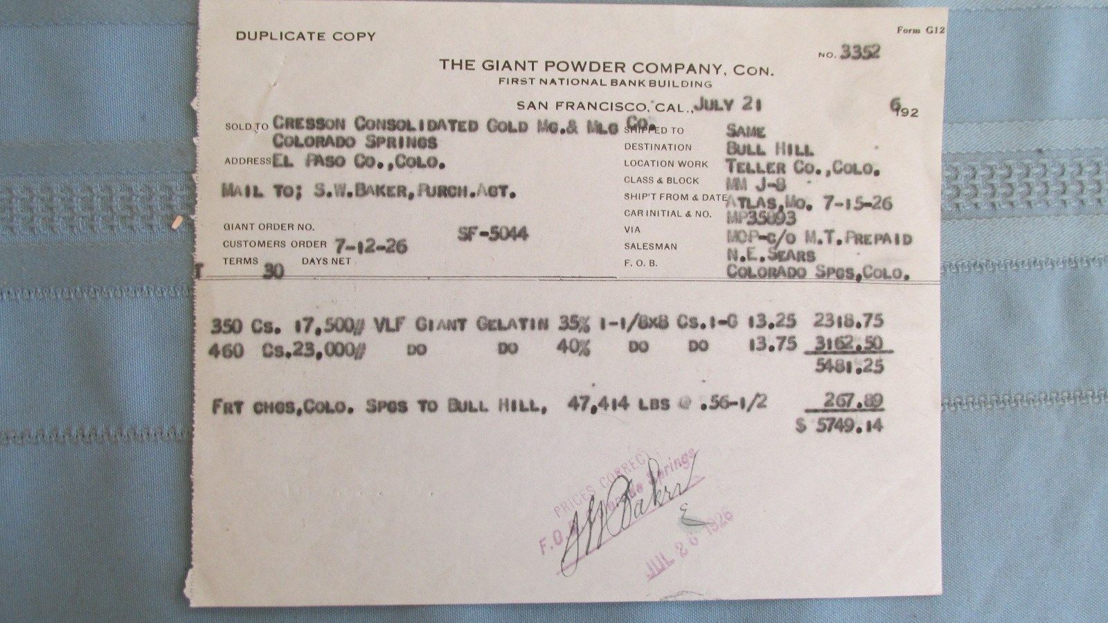 Giant Powder Company Billhead-Train Car Loads Explosive-Cresson Gold Mines-Colo.