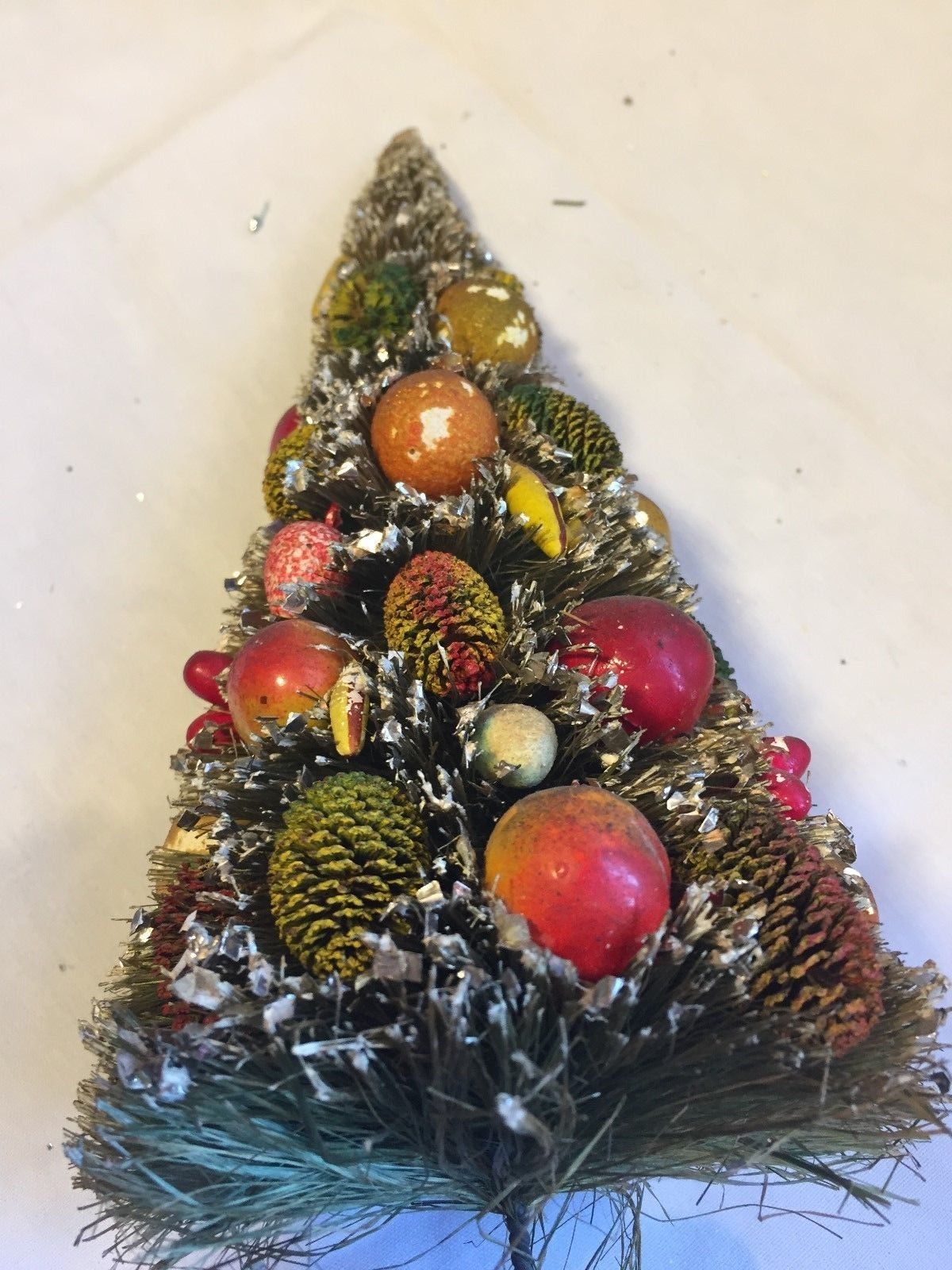 Title (ebay affiliate link): Vintage Bottle Brush Vintage Christmas Tree Fruit & Pine Cones Gold Glitter 10"