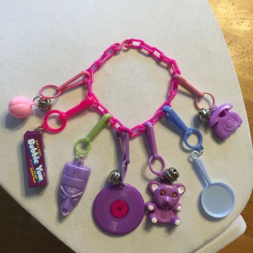Title (ebay affiliate link): Vintage New 80's 1980 Plastic Bell Charm Bracelet Retro 90's Party Fun 7 Charms