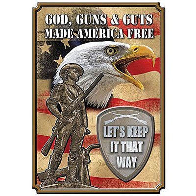 Title (ebay affiliate link): God Guns and Guts Weatherproof Embossed Tin Sign Pre-Punched for Hanging