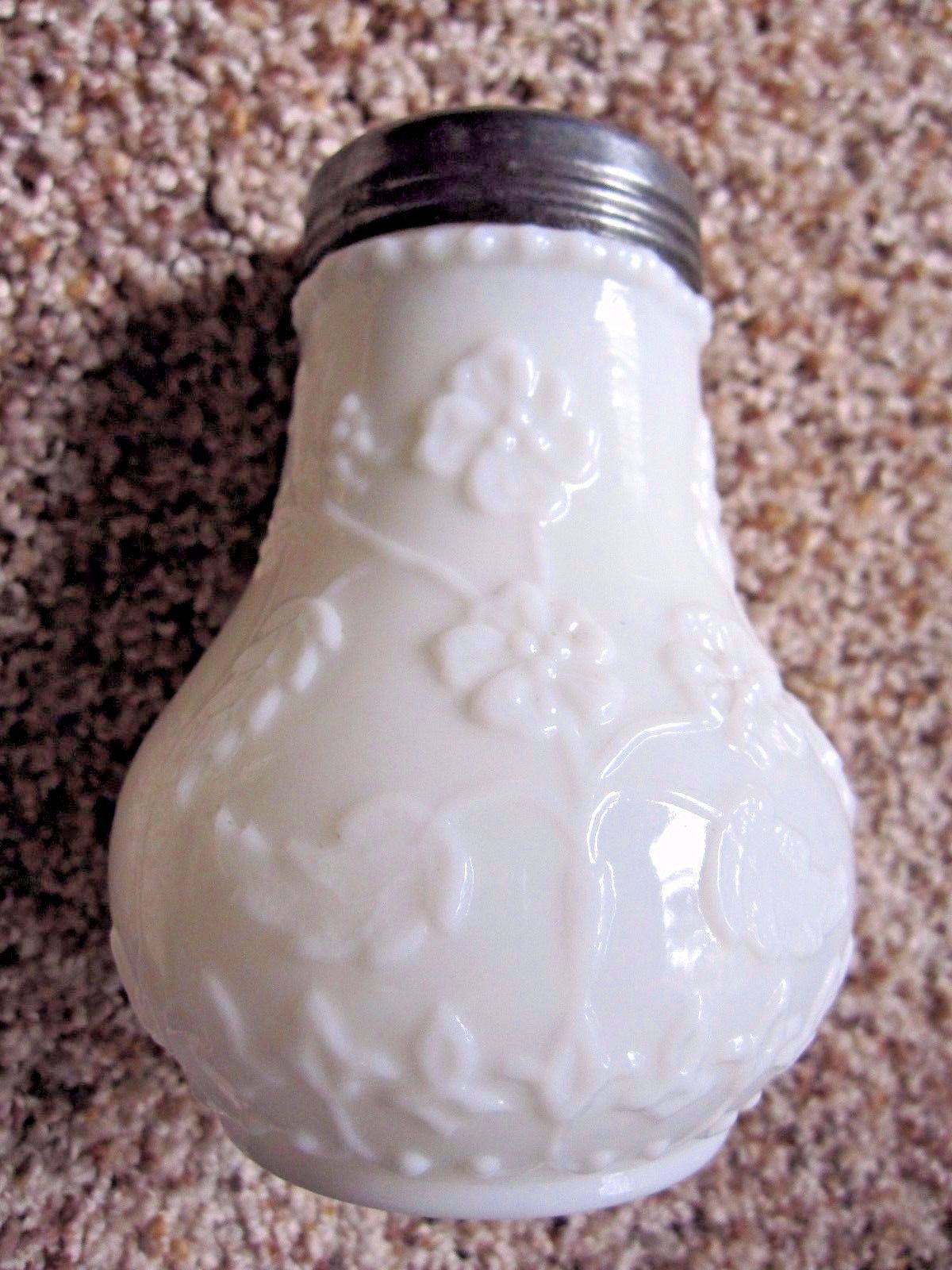 Antique Opaque White Milk Glass SUGAR SHAKER FLOWER Kitschen Morning glory bead