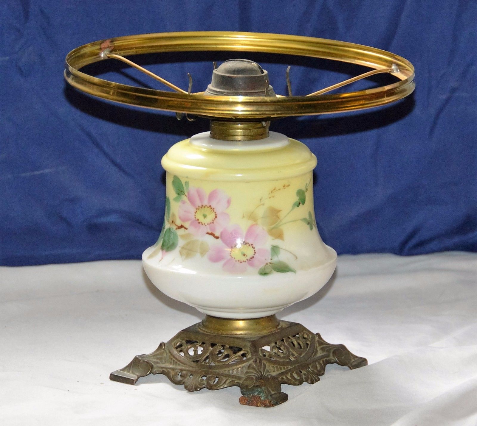 Title (ebay affiliate link): Antique Oil Lamp Hand Painted Milk Glass w/ Brass Base Pat 1873