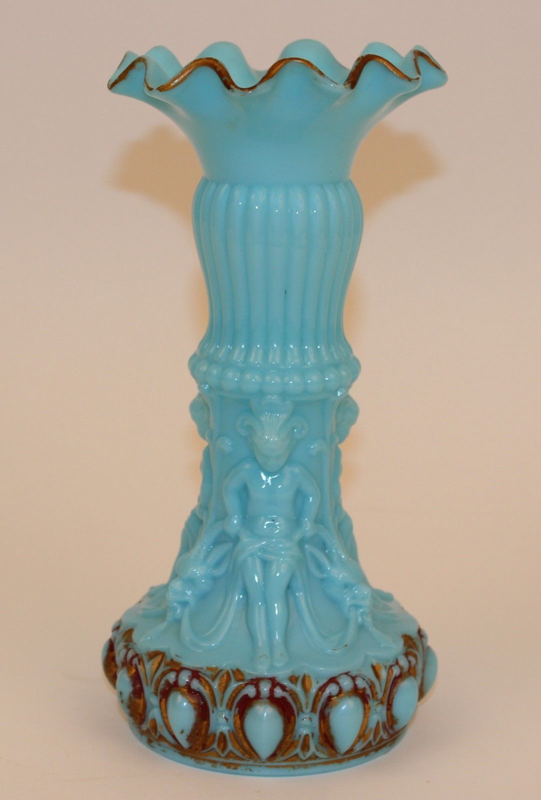 Title (ebay affiliate link): 19c BLUE MILK GLASS VASE NUDES & RAM'S HEADS VALLERYSTHALL OR SOWERBY