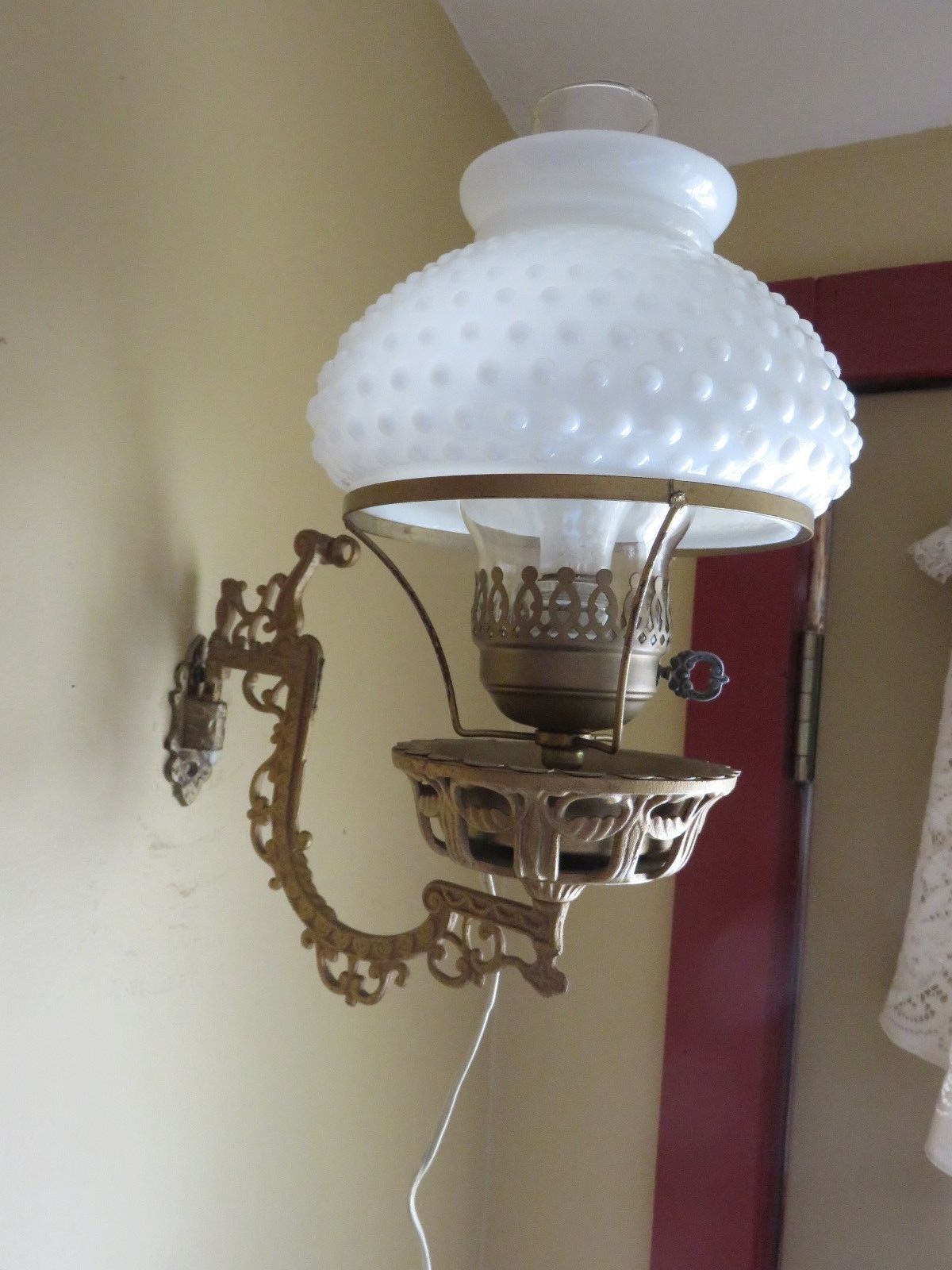 Title (ebay affiliate link): VINTAGE CAST IRON WALL SCONCE HANGING BRACKET LAMP HOBNAIL MILK GLASS SHADE
