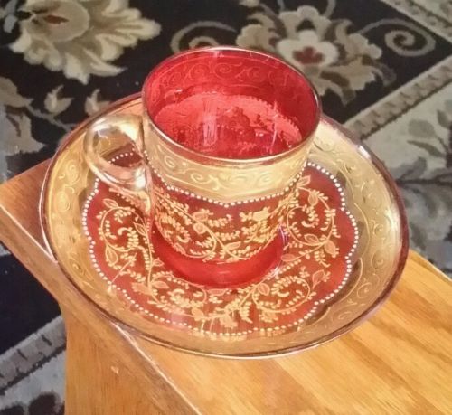 Vintage Cranberry and Gold Demitasse Cup and Saucer.