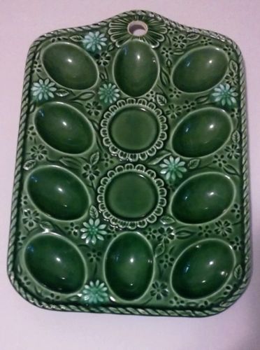Title (ebay affiliate link): Vintage Ceramic Deviled Egg or Oyster Plate with Hang Hole. Olive Green