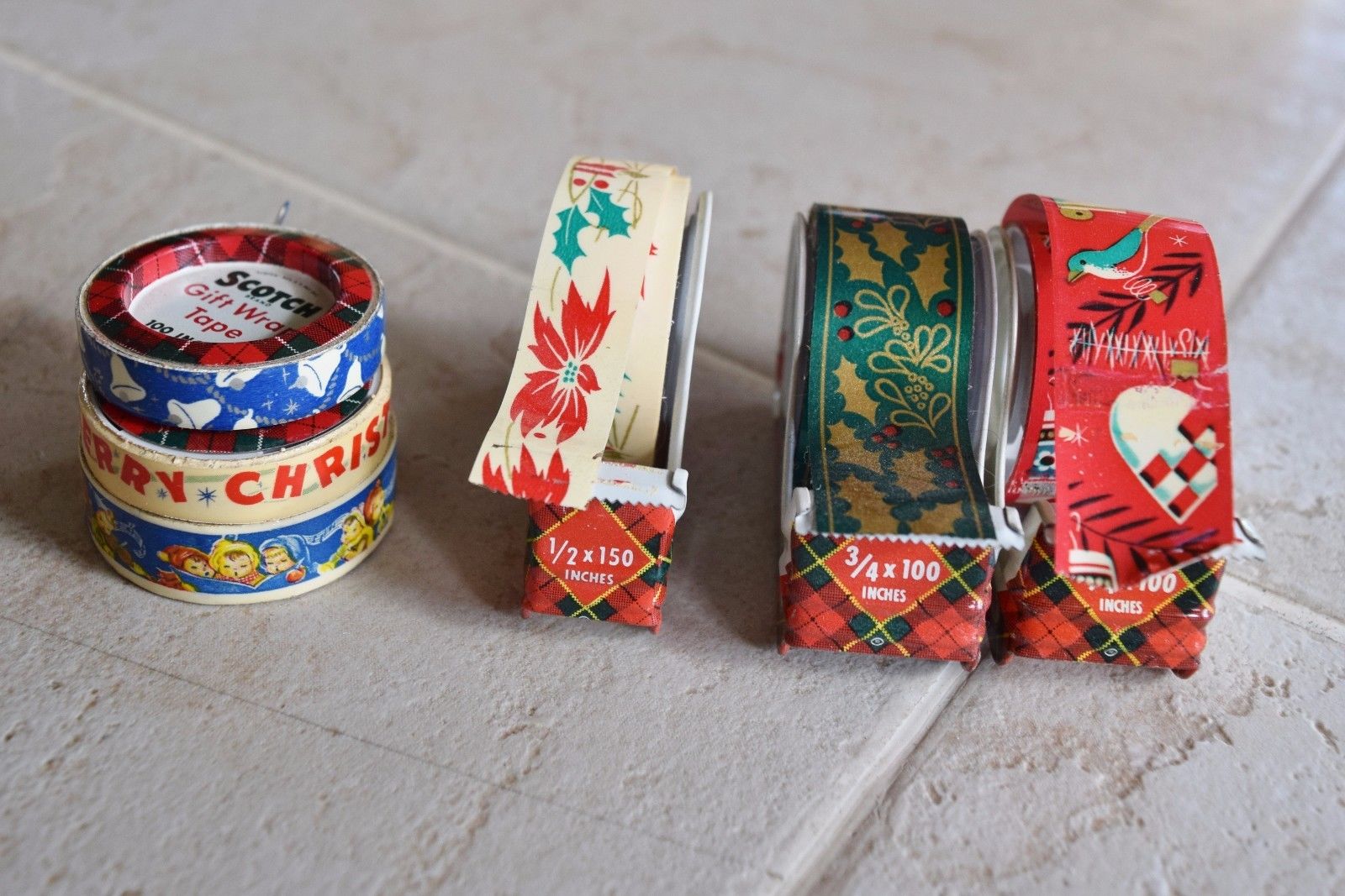 Title (ebay affiliate link): Vintage Lot 6 Scotch Gift Tape Tins Dispensers Christmas Designs Ornaments Bells