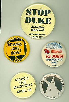 5 Vintage 1970's Peace Black Justice Cause Pinback Buttons Demand Jobs Stop Duke