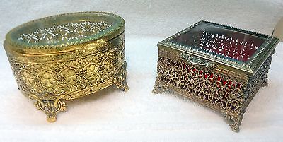 VTG BEVELED GLASS GOLDEN FILIGREE ORMOLU JEWELRY CASKET TRINKET BOXES