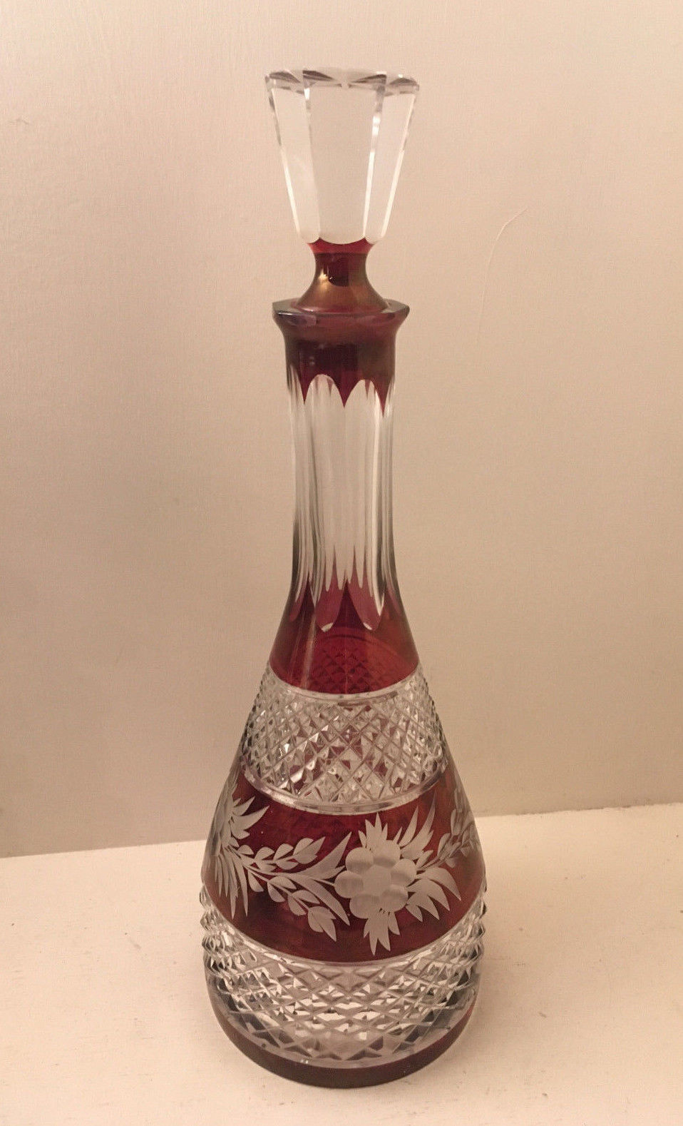 Title (ebay affiliate link): Ebeling & Reuss Cranberry Ruby Cut to Clear CRYSTAL Wine DECANTER w Stopper-15"