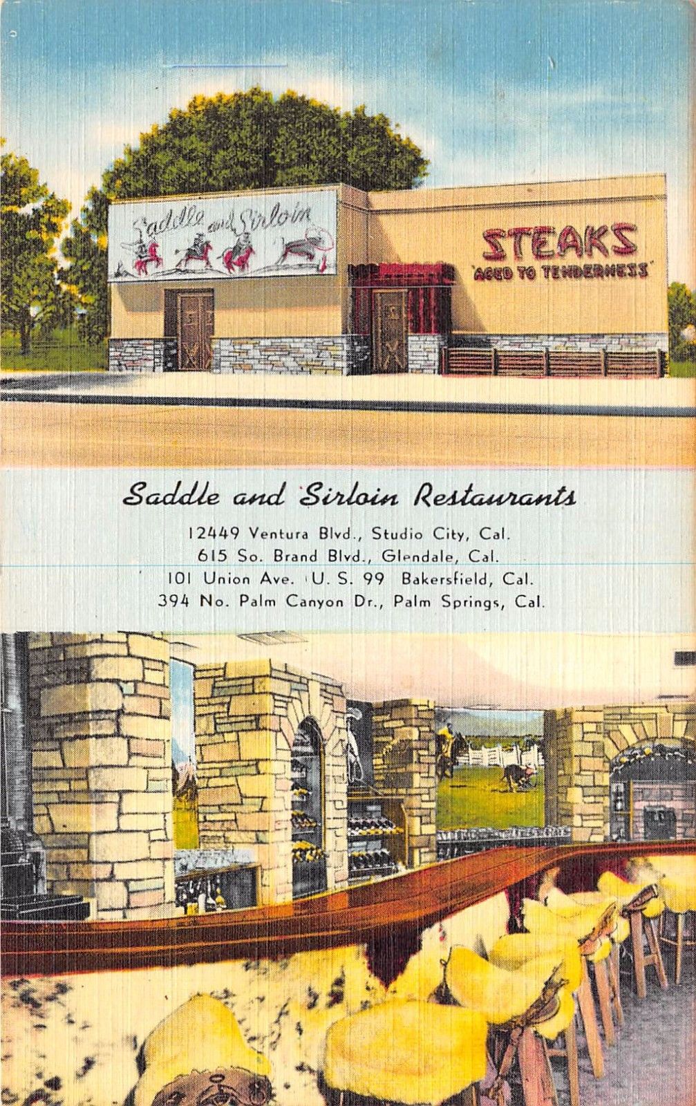 Title (ebay affiliate link): Palm Springs, Glendale, Bakersfield CALIF~ Saddle & Sirloin Restaurants ~ Linen