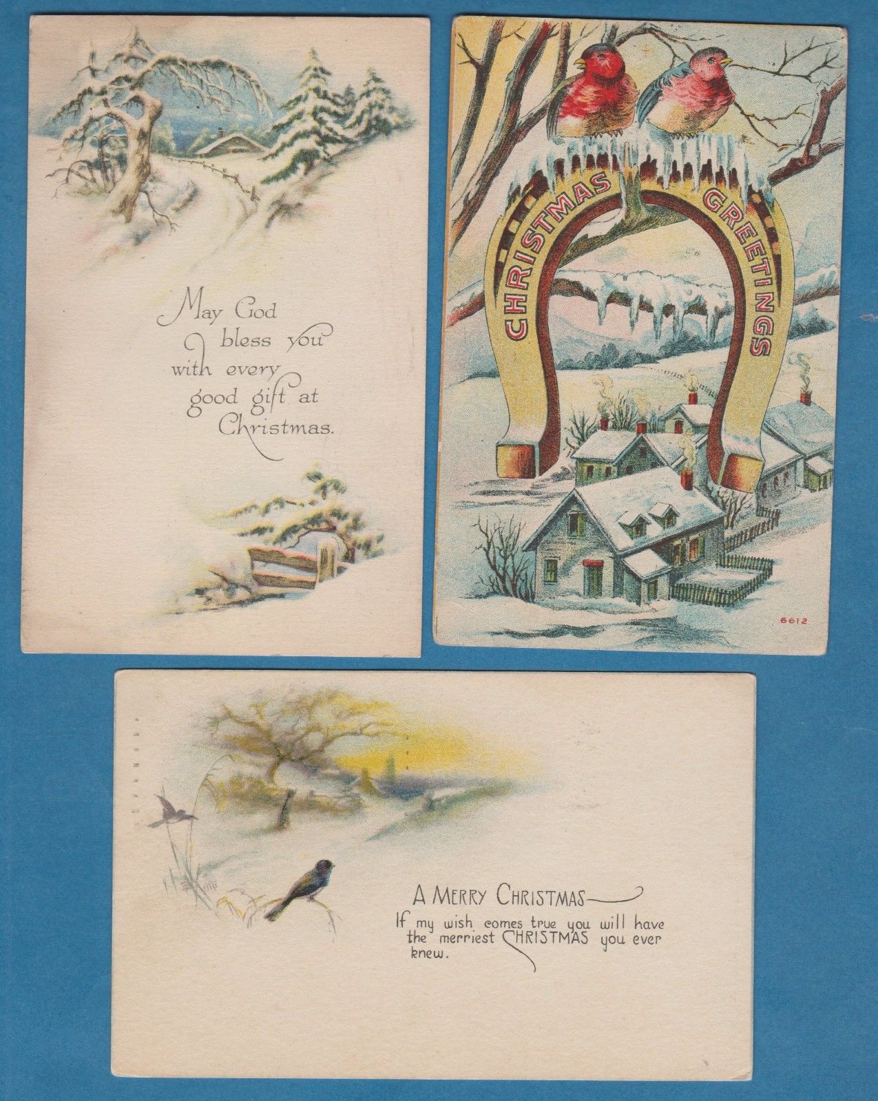 Title (ebay affiliate link): 3 card lot showing horseshoe...birds...snow scene/ non-linen postcard