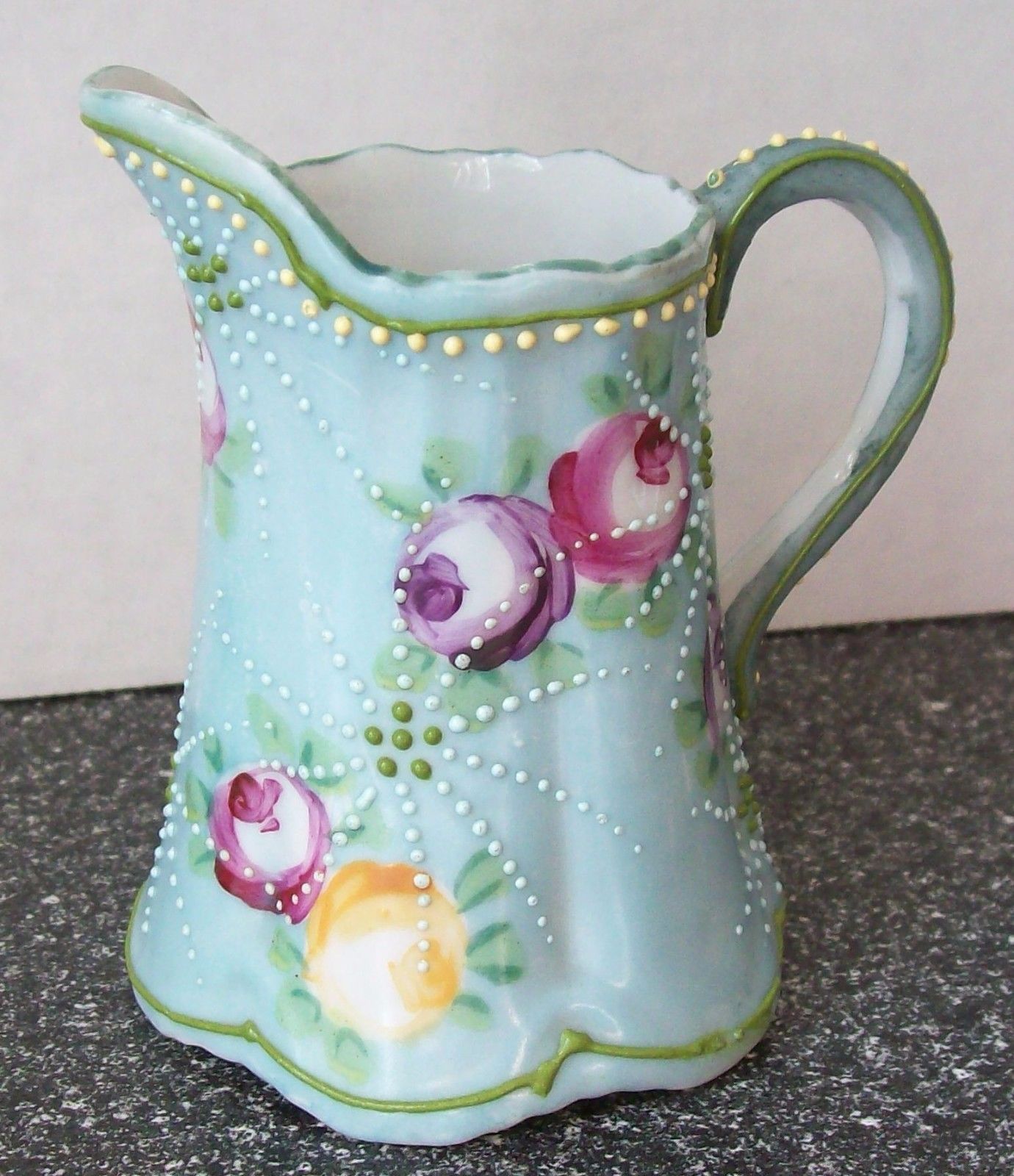 Title (ebay affiliate link): Antique LIGHT BLUE PORCELAIN CREAMER Pink & Purple Flowers MORIAGE STARBURSTS