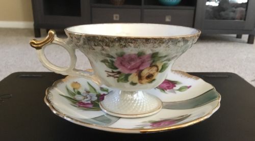 Title (ebay affiliate link): Vintage Pink,Green,yellow, and Gold Rose & Flowers Demi Tea Cup and Saucer