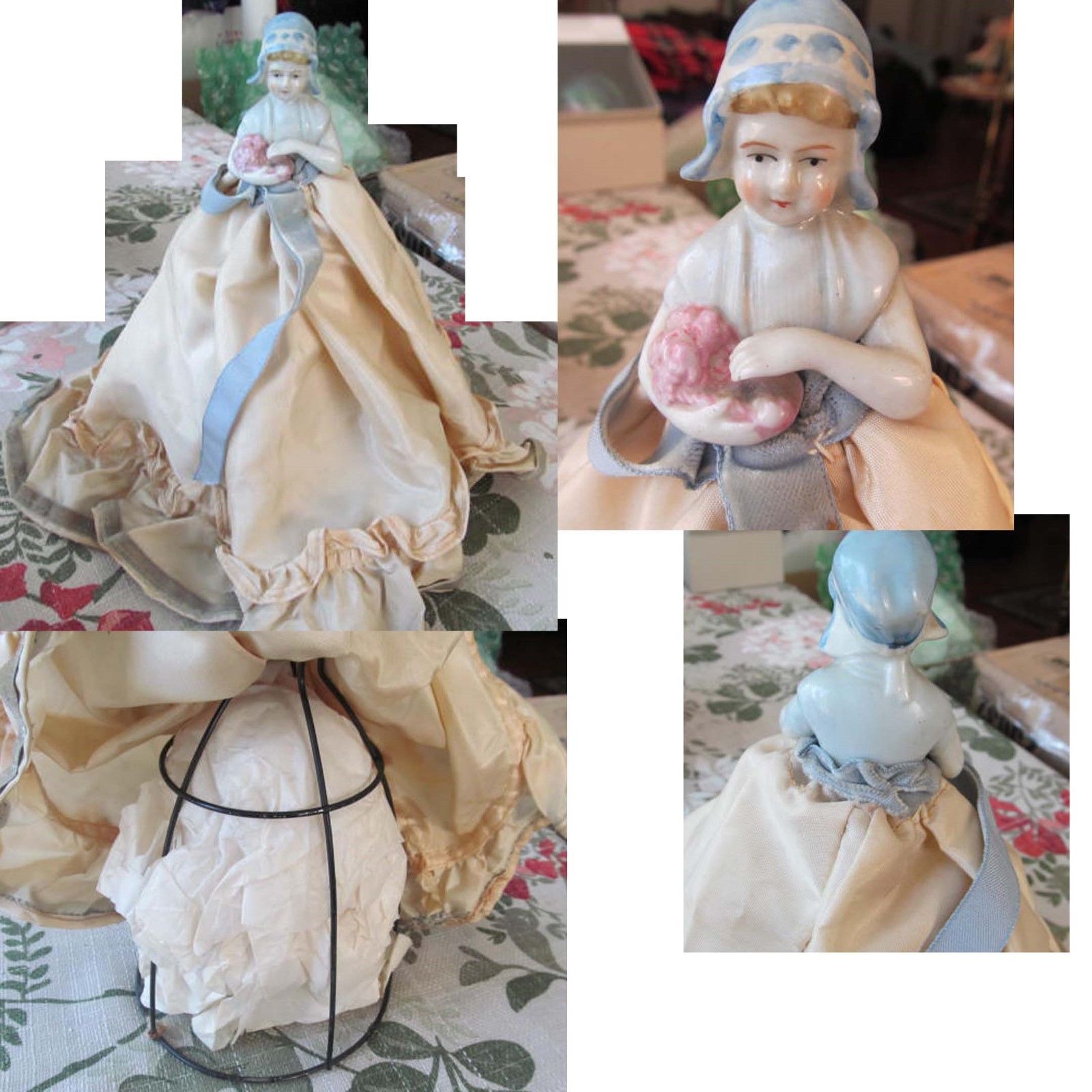 Darling Vintage Porcelain Half Doll on Hoop Skirt Stand with Dress