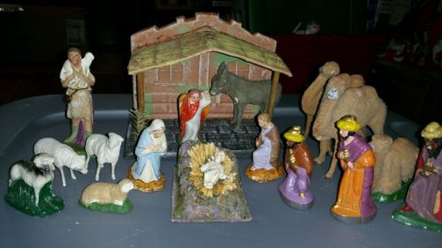 Title (ebay affiliate link): Antique Nativity German Putz(?) + Flocked camels, French and Italian Figures