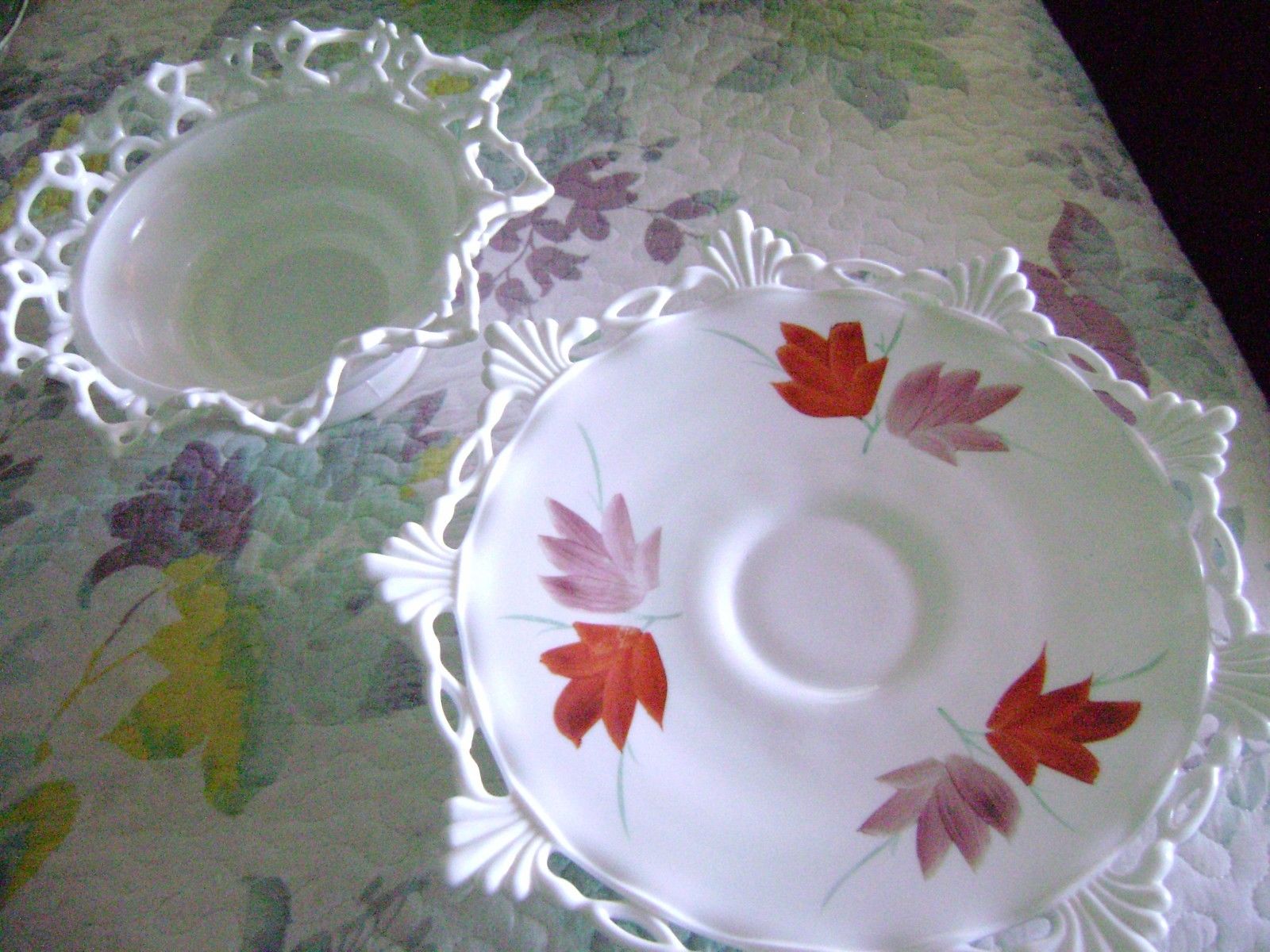 Title (ebay affiliate link): 2 Vtg Lattice Edge Milk Glass Pieces-1 Bowl & 1 Leaf Center Cake/Cookie Plate