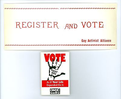 Title (ebay affiliate link): 1 Vintage 1980-90's Gay Voters Political Pinback Button & 4 Gay Vote Cards