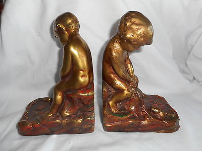 Antique Painted BRONZE Naked Boy with Koi Pond BOOK ENDS unsigned ex RARE