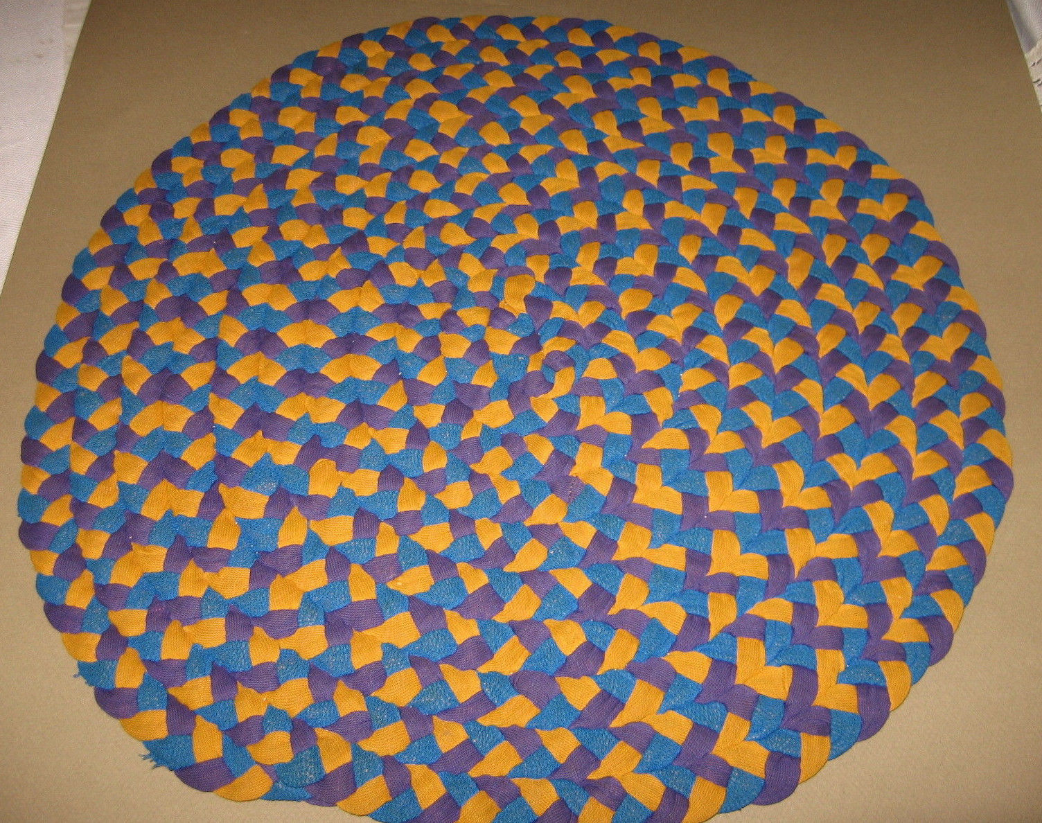 Title (ebay affiliate link): Vintage Hand Braided Round Rag Mat Unusual Colors--Blue/Gold/Purple
