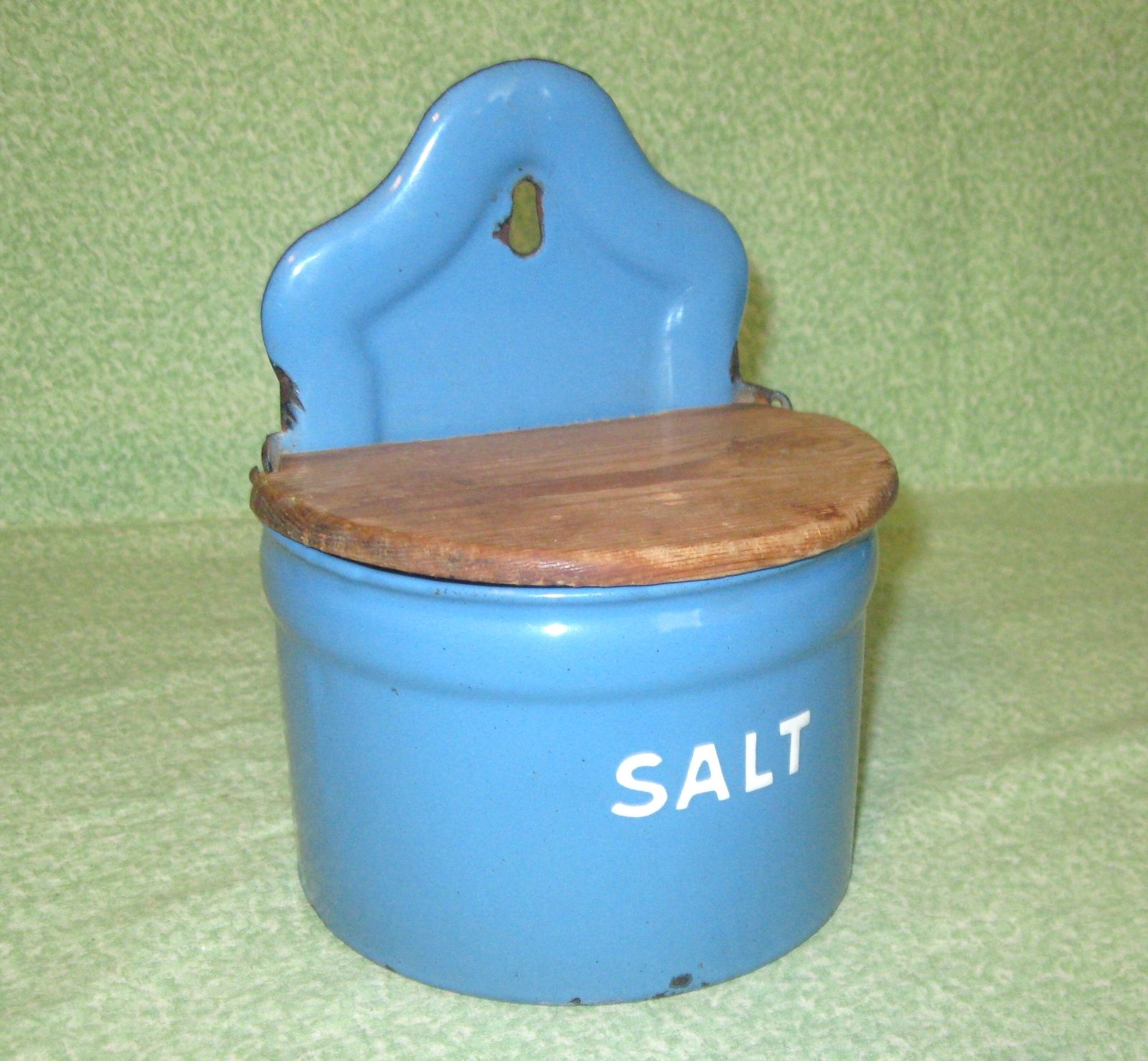 Title (ebay affiliate link): Antique Blue Enamelware Hanging Salt Box / Wooden Lid - Denmark - Danish