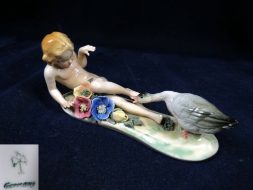 Title (ebay affiliate link): ANTIQUE KARL ENS BLOND BOY AND GOOSE PORCELAIN FIGURINE GREEN WINDMILL MARK