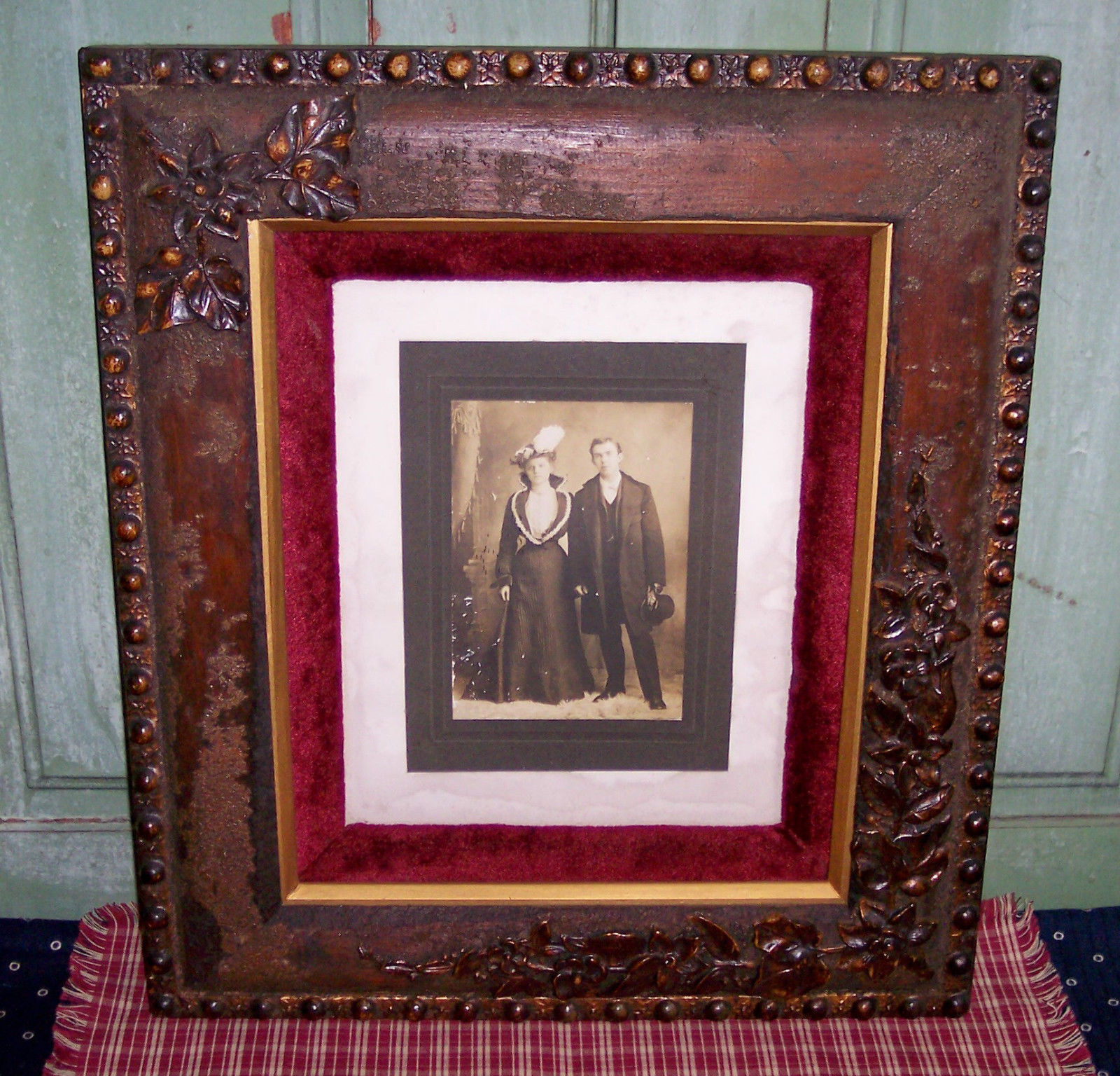 Title (ebay affiliate link): Antique Victorian Gesso Floral Star & Dot Pattern Red Velvet Wood Picture Frame