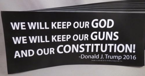Title (ebay affiliate link): WHOLESALE LOT OF 20 TRUMP GOD GUNS AND CONSTITUTION BUMPER STICKERS PRESIDENT US
