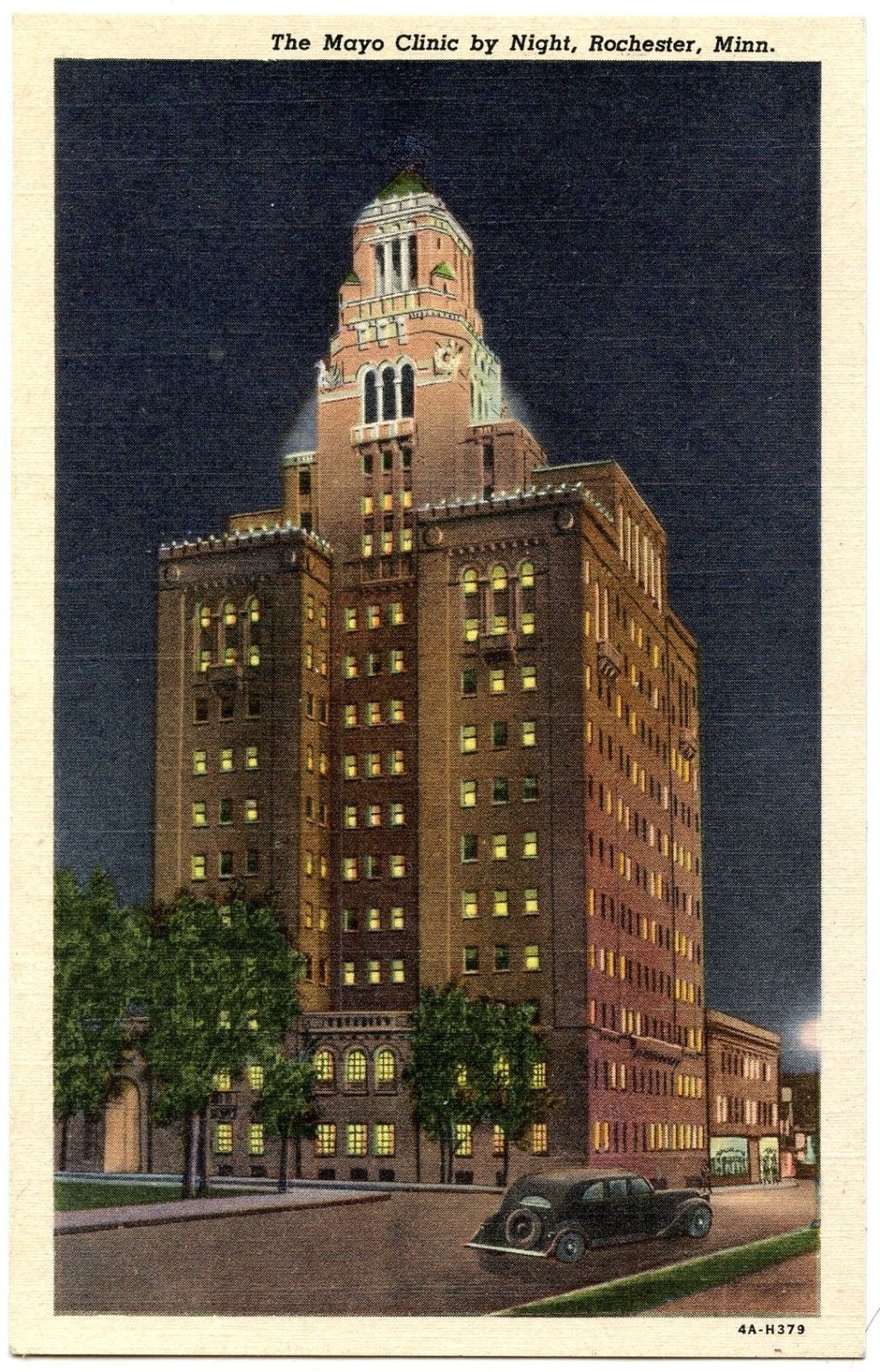 Title (ebay affiliate link): B4530 The Mayo Clinic by Night Rochester Minn. MN '34 Teich Linen PC No. 4A-H379
