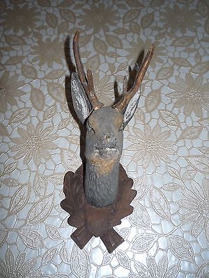 ANTIQUE HAND CARVED WOOD ROEBUCK HEAD ROE DEER STATUE WALL DECOR