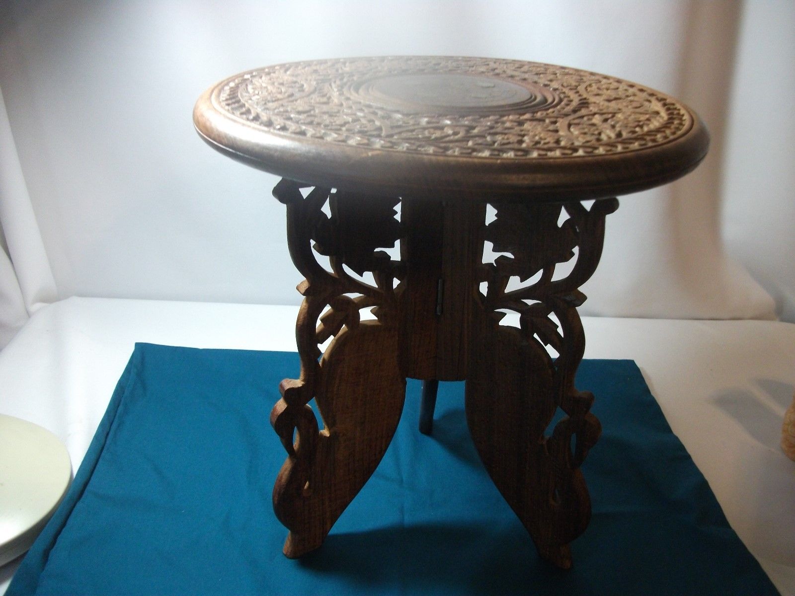Title (ebay affiliate link): Wooden Round top carved maple leaf designtable , folding legs India