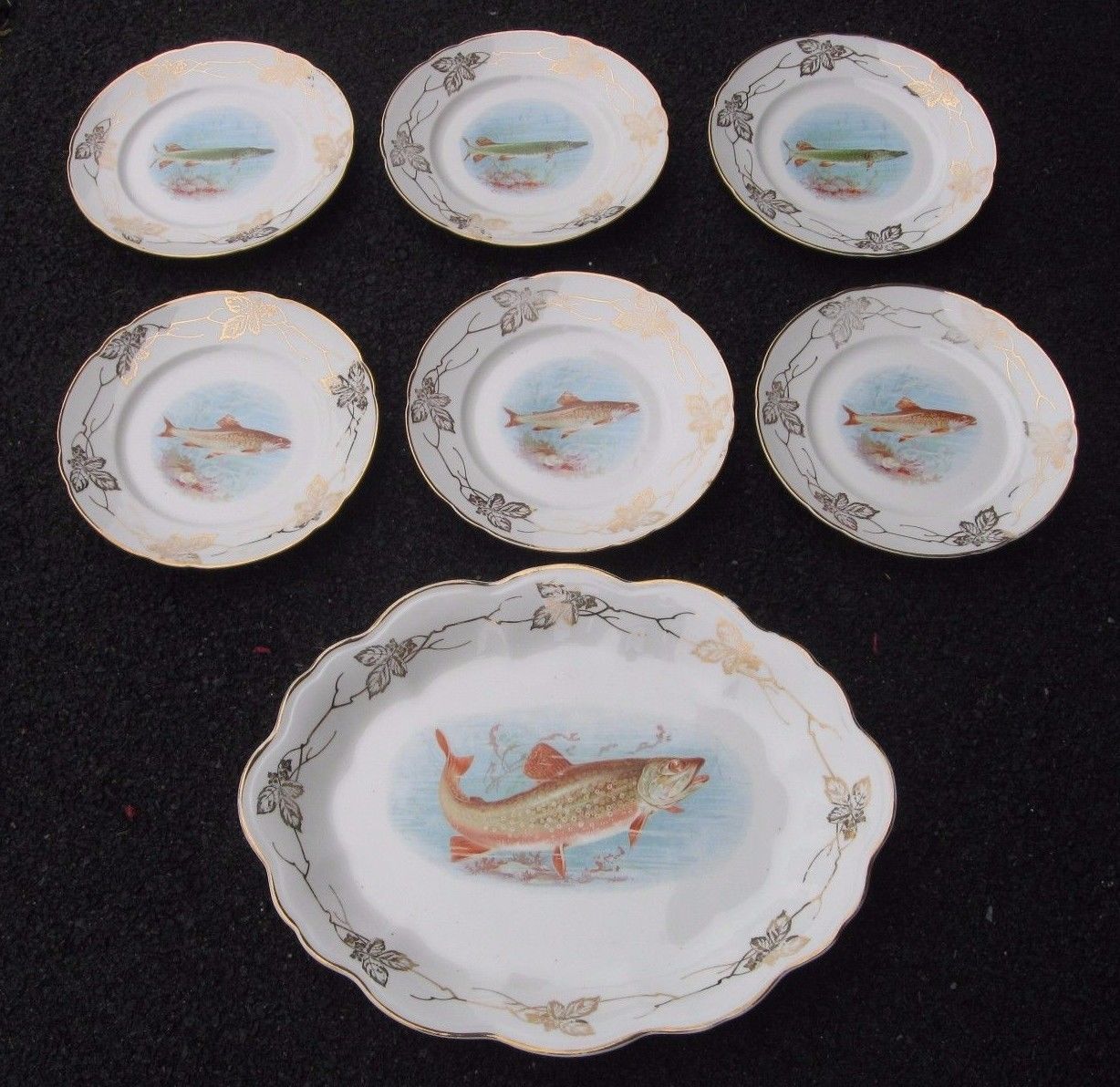Title (ebay affiliate link): SET Antique Fishing Fish Design 17" Serving Platter & 6 Dinner 10" Plates China