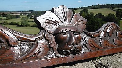 SUPERB 19thc GOTHIC OAK CARVED GREEN MAN PEDIMENT C.1870
