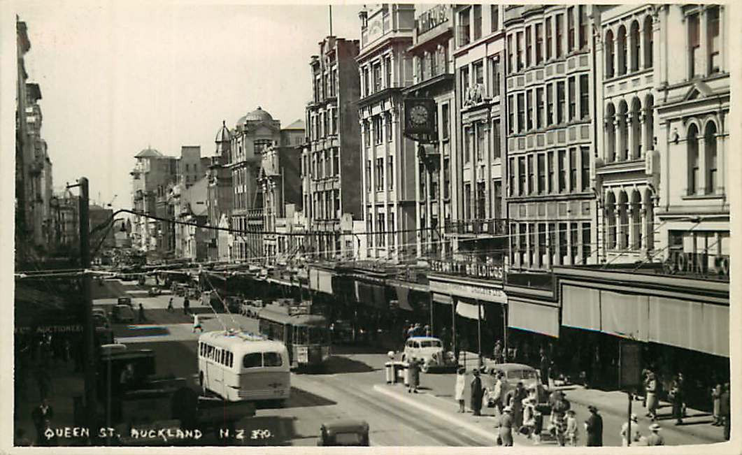 Title (ebay affiliate link): Real Photo Postcard Queen Street Scene, Electric Bus, Auckland, New Zealand