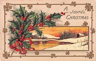 Title (ebay affiliate link): Frame of Gold 4-Leaf Clovers & Holly Around Snowy River Scene-1912 Christmas PC