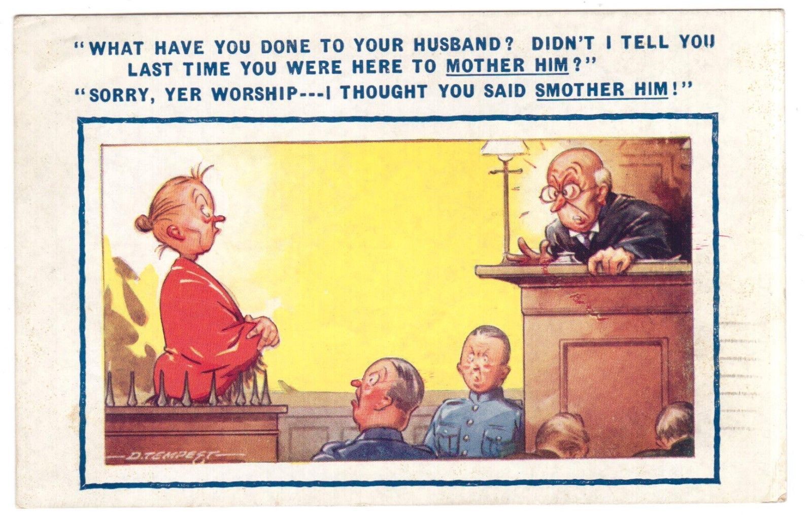 Title (ebay affiliate link): JUDGE TO WIFE TOLD YOU MOTHER HIM THOUGHT YOU SAID SMOTHER HIM COMIC BAMFORTH PC