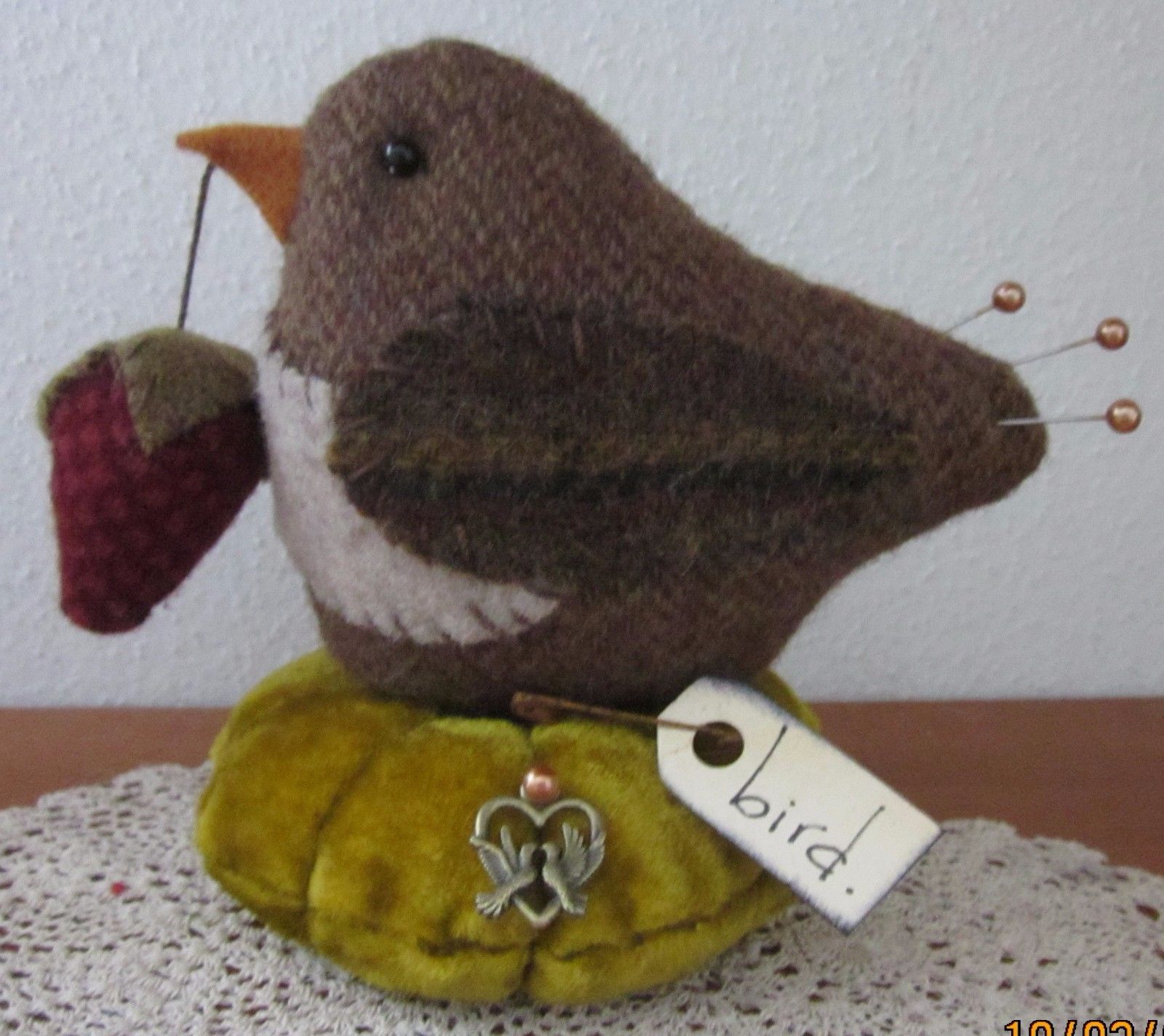 Title (ebay affiliate link): PRIMITIVE WOOL BIRD CHARM STRAWBERRY MAKE DO PIN CUSHION PFATT