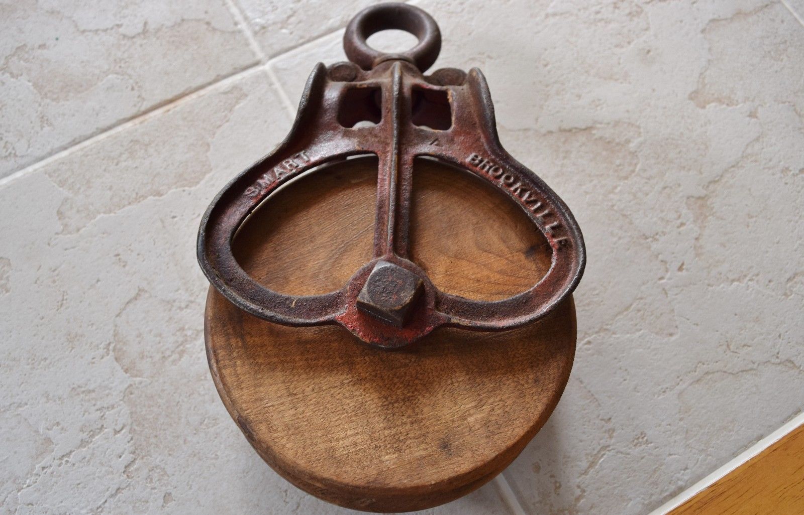 Title (ebay affiliate link): Antique Primitive Cast Iron Barn Pulley Vintage Farm Tool Smart Brookville NICE!