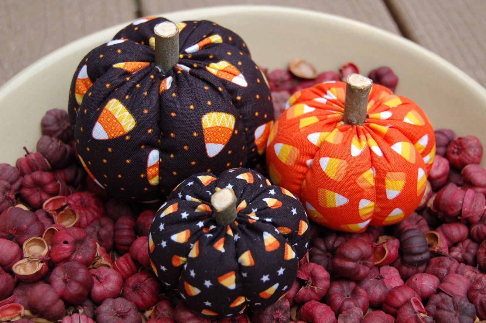 Title (ebay affiliate link): Primitive Fall Halloween Candy Corn Print Pumpkin Ornies, 3 Diff Prints