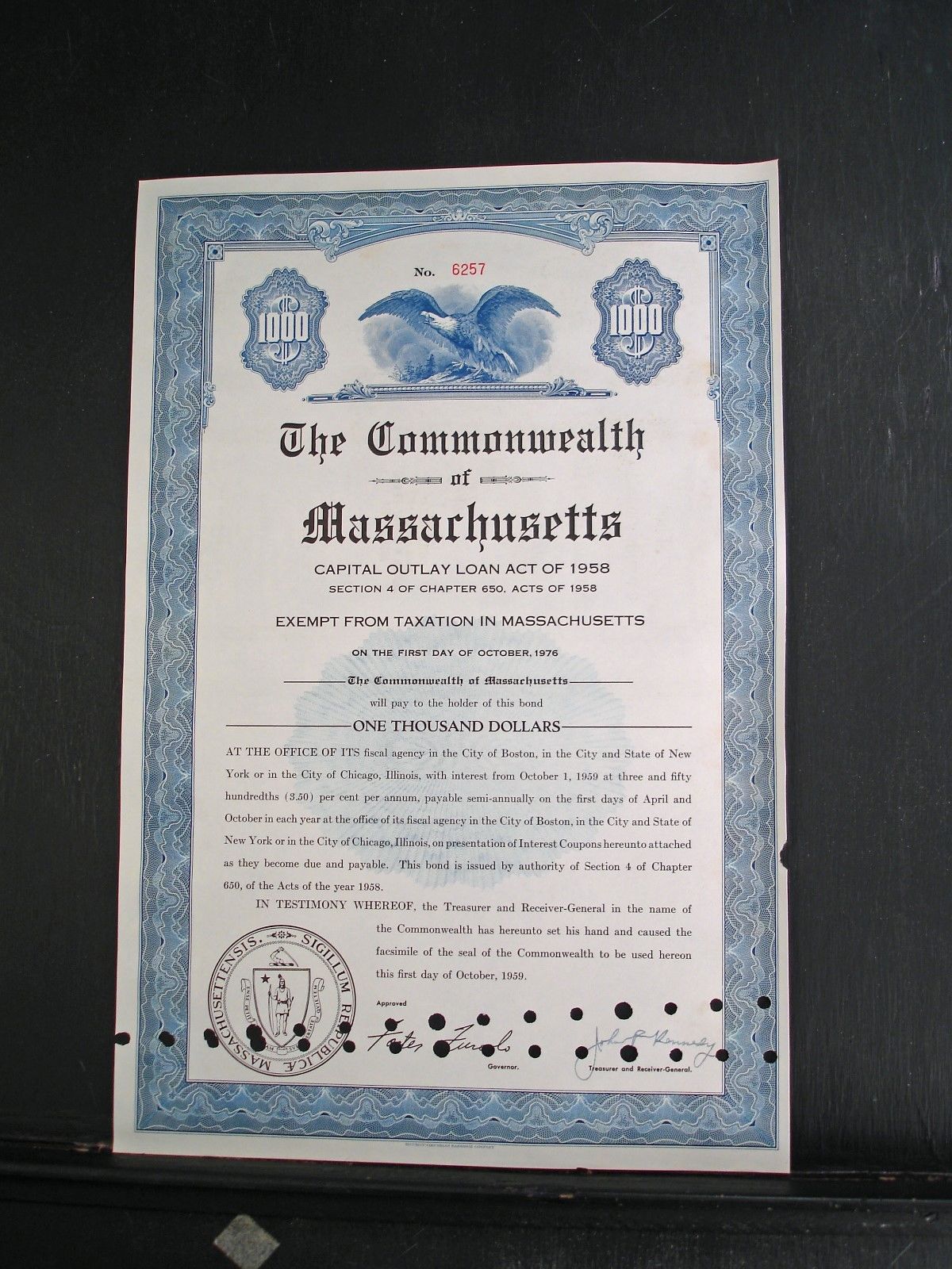 Title (ebay affiliate link): 1958 MASSACHUSETTS BOND - SIGNED BY TREASURER JOHN F. KENNEDY, BEAUTIFUL