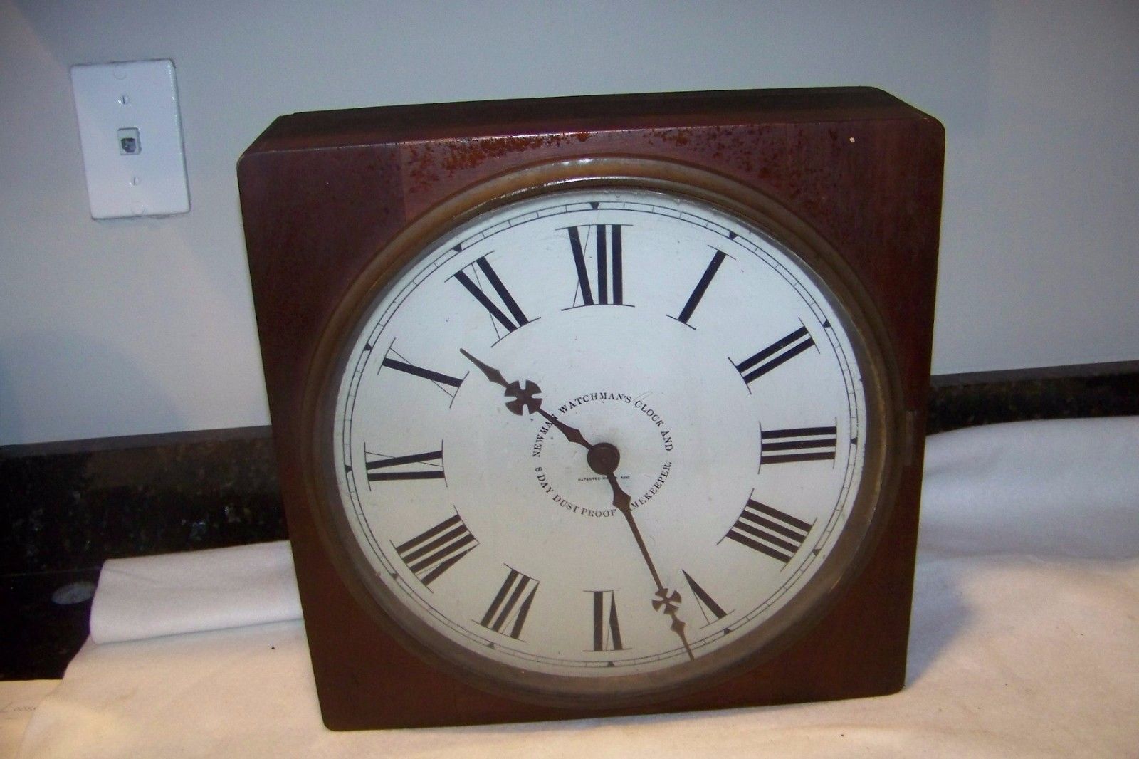 Title (ebay affiliate link): Antique Newman Watchman's Clock & Time Keeper Old Wooden Case 1880 Patent 8 Day