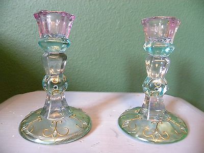 Pair Partylite Mardi Gras Taper Candle Holders Iridescent Lavender Aqua Set of 2
