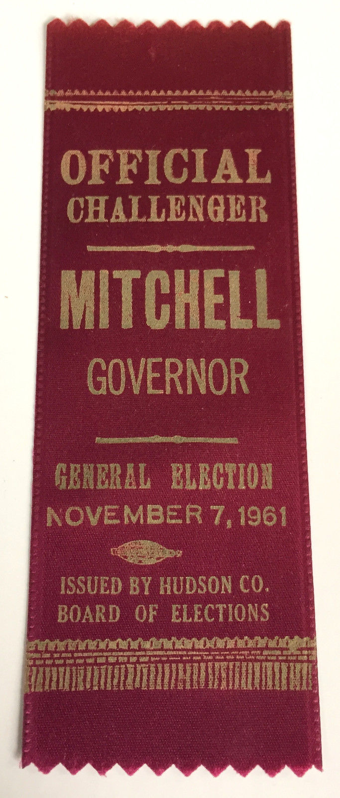 Title (ebay affiliate link): 1961 NEW JERSEY GOVERNOR MITCHELL/EISENHOWER SECY LABOR ELECTION RIBBON HUDSON C
